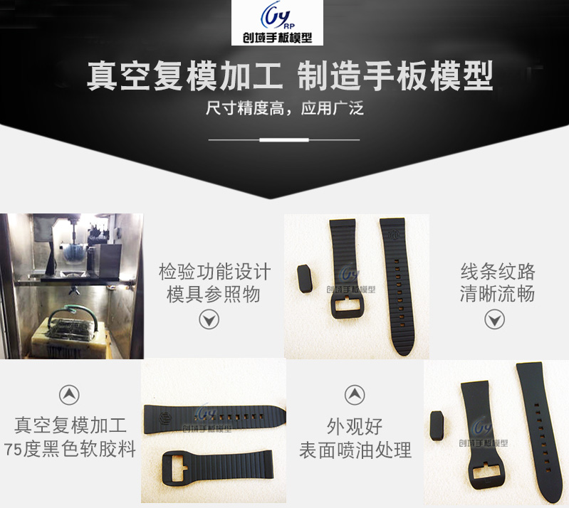 手表帶手板主要由SLA激光快速成型制作原型,真空復模加工完成,材質:PU料。由復模制作出來的樣品再經過后處理技術人員的細心打磨表面工藝處理,是您創作的體現,制作過程需要3個工作天。屆時我司將與快遞的方式送達客戶手中。